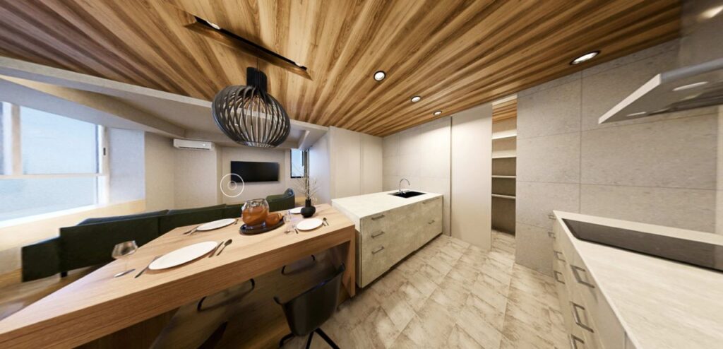 ダイニングテーブルとキッチンカウンターを一体化することで、