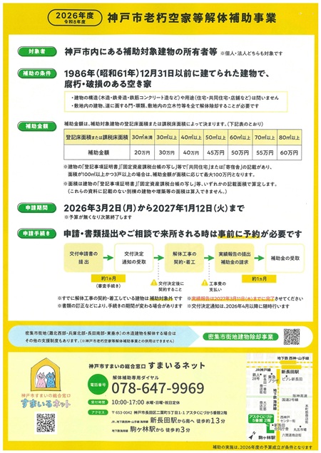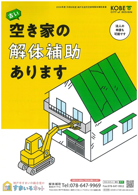 2026年度(令和8年度)神戸市老朽空家等解体補助事業が発表されました。